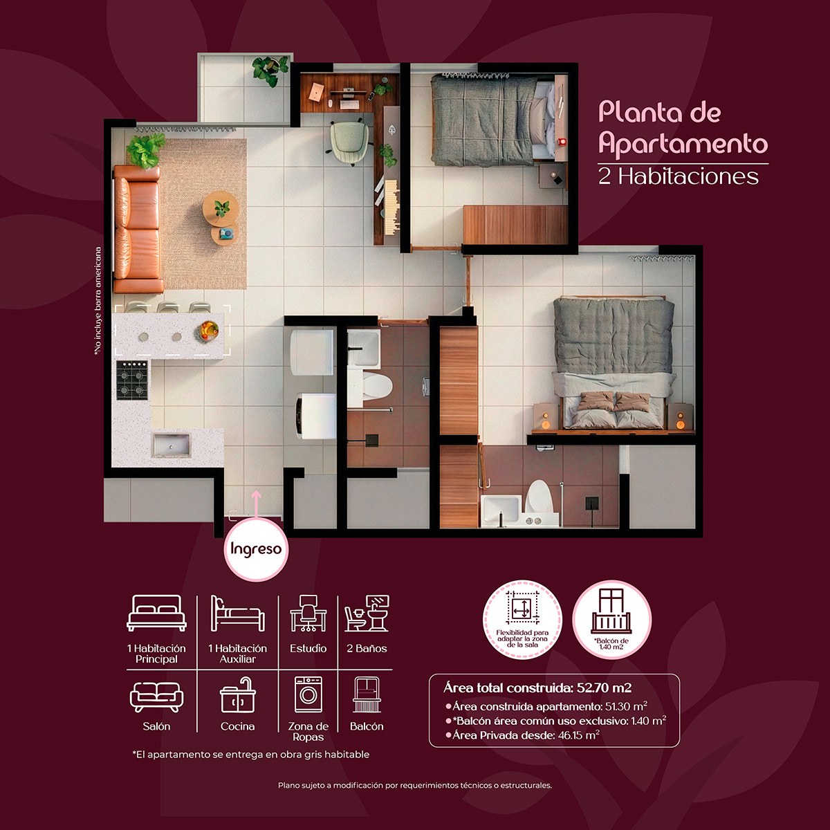 Área Construida Apartamento: 51.30 m2